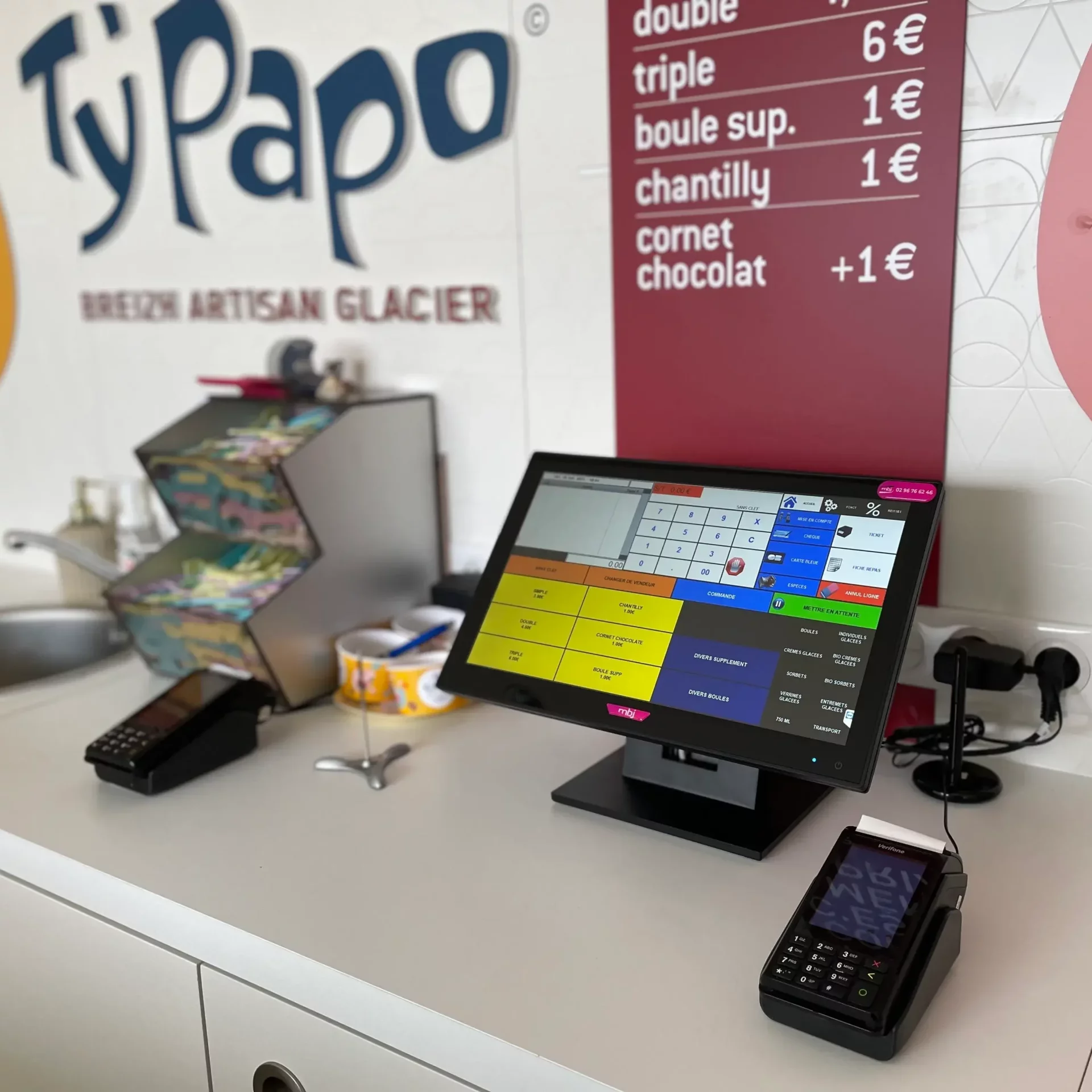 La caisse enregistreuse est configurée pour une activité de glacier avec un fort débit en période estivale, des ventes répétitives et des produits personnalisables. Elle centralise l’encaissement et le suivi des ventes.